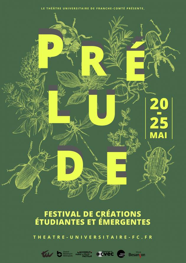 Le festival Prélude organisé par le Théâtre Universitaire de Franche-Comté à Besançon est une manifestation dédié aux créations émergentes étudiantes. Se tenant habituellement fin mai, il propose durant cinq jours une programmation pluridisciplinaire mêlant théâtre, concerts, performances et débats. L’événement met en lumière des jeunes artistes et groupes culturels du territoire, soutien dans le cadre d’un dispositif d’accompagnement artistique. Fidèle à ses valeurs, Prélude privilégie l’accessibilité, tant pour le public (tarifs très abordables ou gratuits) que pour les pratiques.